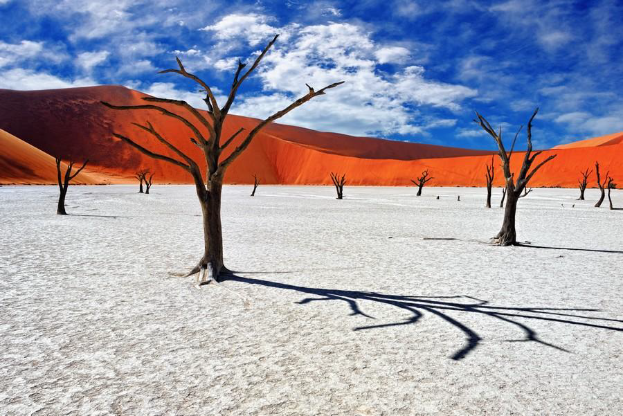 Il deserto del Namib è uno tra i più antichi della terra. È in gran parte incluso in aree naturali protette, tra cui il Namib-Naukluft National Park, il parco nazionale più esteso dell’Africa. Le sue dune, tra le più alte del pianeta, sono famose per le forme sinuose e i colori che cambiano in base all’ora: dal rosso intenso dell’alba all’oro di mezzogiorno, fino alle tinte arancio del tramonto. A dispetto di quanto s’immagina quando si pensa al deserto, il Namib ospita una varietà sorprendente di flora e di fauna che si sono adattate all’ambiente, tra cui l’oryx (resistente alla siccità) e la welwitschia mirabili, una pianta che assorbe l’umidità della nebbia mattutina generata dall’incontro tra l’aria fredda dell’Oceano e il caldo del deserto.
