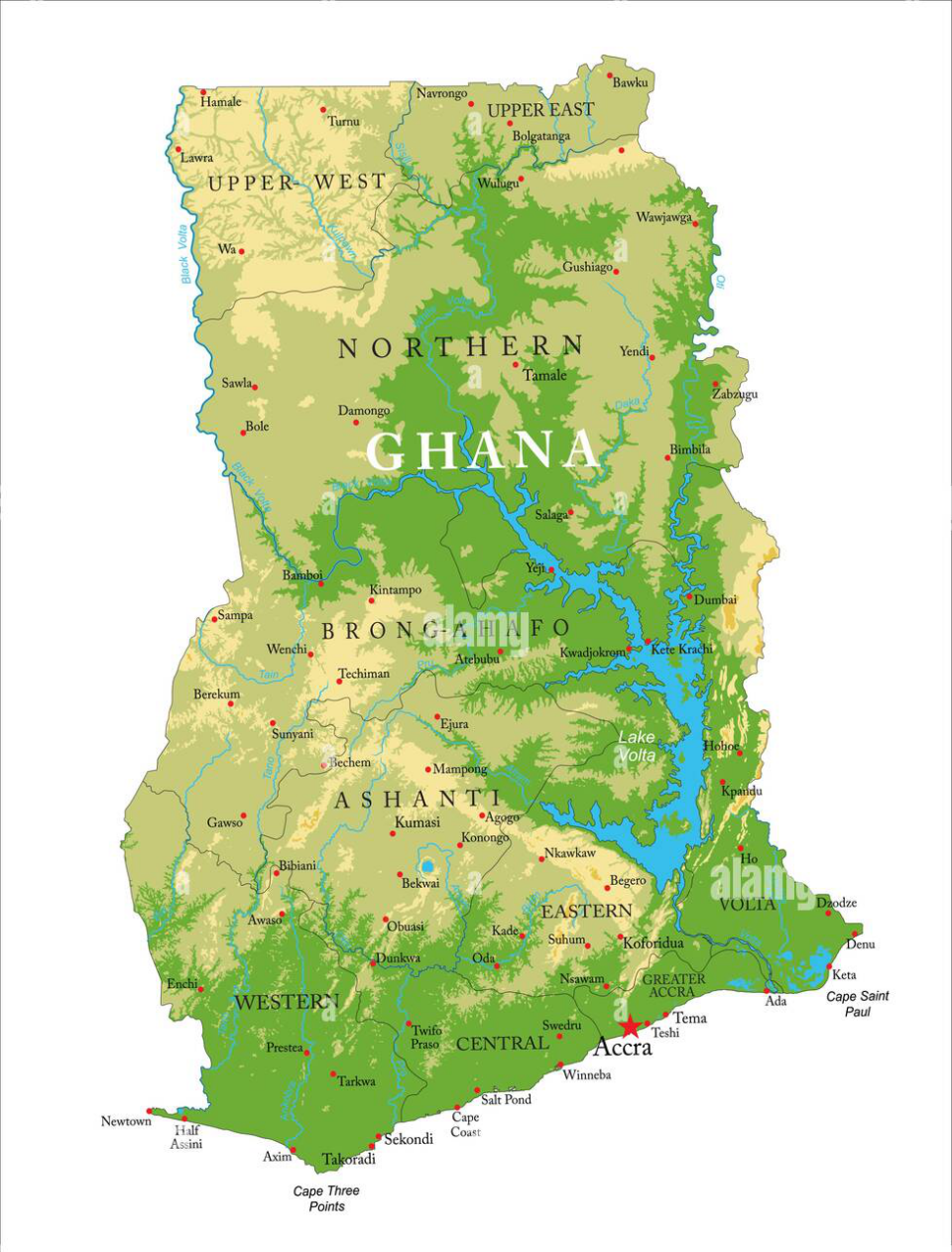 Cartina fisica del Ghana; Fonte: Alamy.it